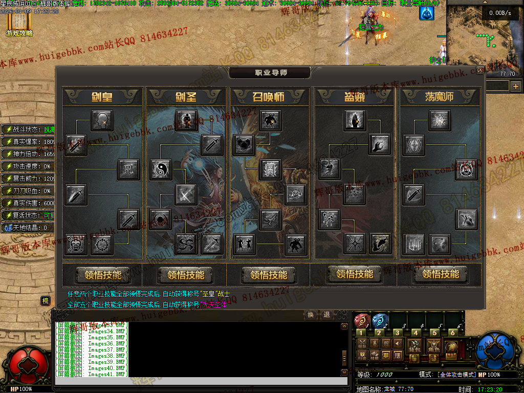 主要手动操作时使用此技能[超爽刷怪神级!——————————————————————————————————职业介绍:共五大职业,剑皇,剑圣,召唤师,盜贼,荡魔师剑皇技能介绍:天生蛮力:神力倍攻10%烈火精通:伤害提高20%幽灵盾:为附近5x5友军提供10%最大攻击力.持续5小时,每次释放需要强者证明x20开天精通:伤害提高20%逐日精通:伤害提高20%高级剑术:最终增伤10%剑皇奥义:攻击时召唤一把巨剑,对单个目标造成当前生命-6%伤害,CD20秒,对怪物人物都有效剑圣技能介绍:快速疗伤:每秒恢复最大生命值1%半月精通:伤害提高20%神圣战甲术:为附近5x5友军提供10%最大攻击力.持续5小时,每次释放需要强者证明x20刺杀精通:伤害提高20%护体神盾:受到攻击5的几率触发神盾护体,无视此次伤害无极剑道:真实伤害提高50%剑圣奥义:攻击速度5% 兵且攻击速度突破上限至200%召唤师技能介绍:兽王契约:宠物与兽王立下契约,可与宠物通灵。