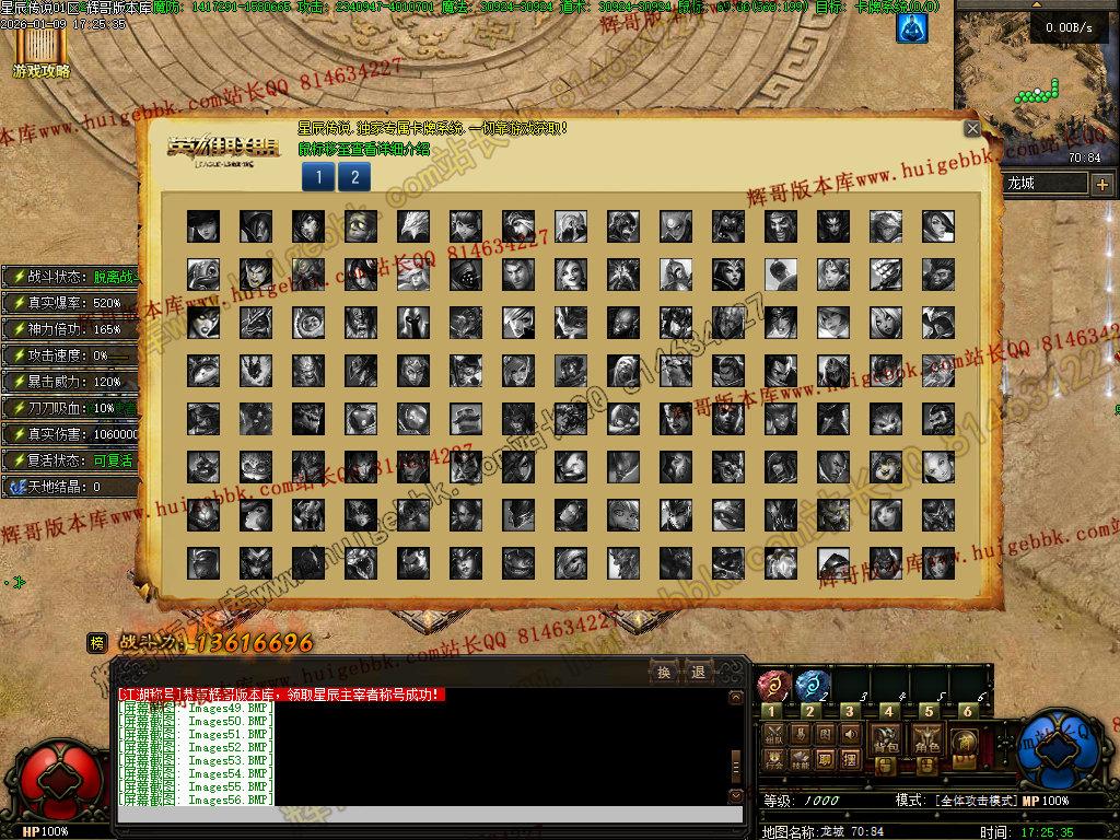 全部五个职业技能全部领悟完成后,自动获得称号”先天圣体*——————————————————————————————————江湖称号:玩家可在这里把称号升级到星辰主宰者,攻击伤害100%爆率提升1.40对怪真实伤害60万时装系统:玩家可在这里把时装升级到蛮荒战神级别,暴击几率20%攻击伤害20%忽视防御20%套装属性:血量增幅30% 攻击增幅30%万剑归宗:对人物3X3范围的怪物造成战斗力x12倍的伤害,CD12秒军鼓系统:玩家可在这里把军鼓升级成神海军鼓,固定属性:攻击力60%追加属性:生命值60%重生:死亡时立即回复100%的血量【CD60:秒】远古神技:魔法盾:免费合成,需技能残页1-9号十步一杀:免费合成,需技能残页1-9号禁忌心法:免费合成,需技能残页1-9号抱月剑法:免费合成,需技能残页1-9号冰霜群雨:免费合成,需技能残页1-9号卡牌系统:激活卡牌30张以上,获得初级卡牌大师称号