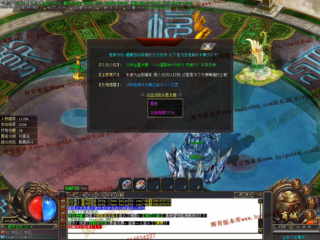 卡牌系统全部激活需要33个卡牌(每激活一次增加10%爆率和400-2500攻击力,属性非常强大!) 全图爆率一致!注意是全图!新手地图都会爆,爆不爆看你人品,建议玩家弄个小号挂机。
