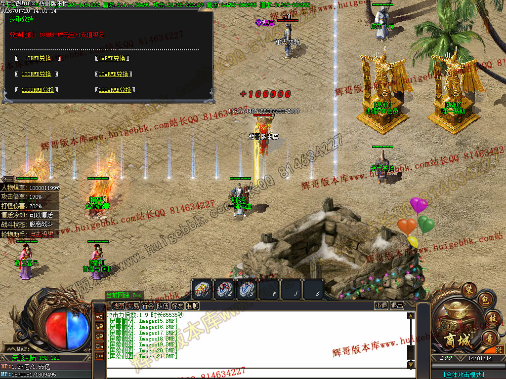 RMB点充值1:10,其余货币在综合服务NPC或者背包综合服务兑换