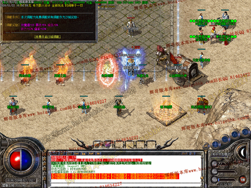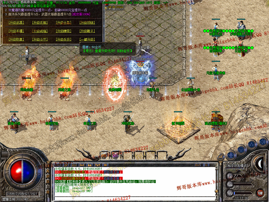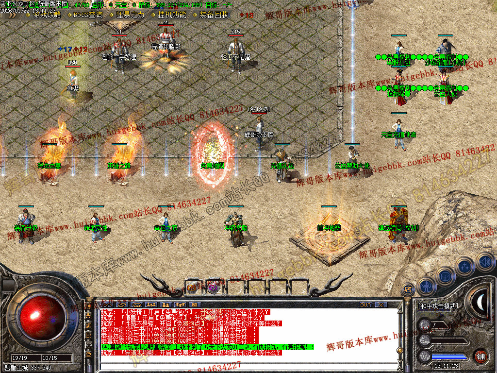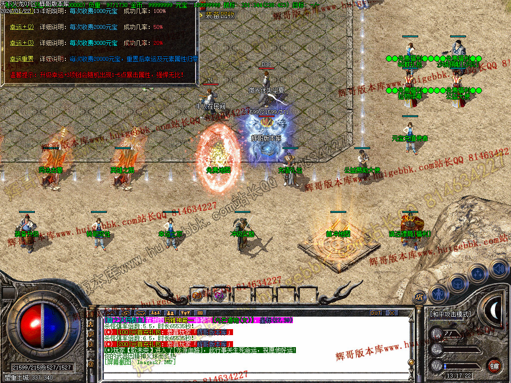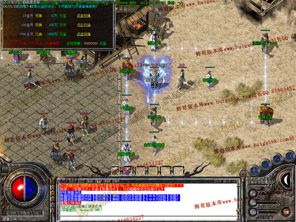 元宝及金币玩家自由交易,土城左边可以任意摆摊,本服越合区人越多(元宝金币根本不愁卖!)