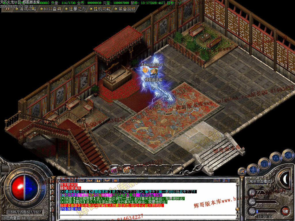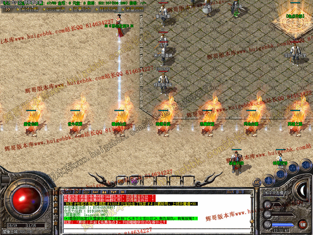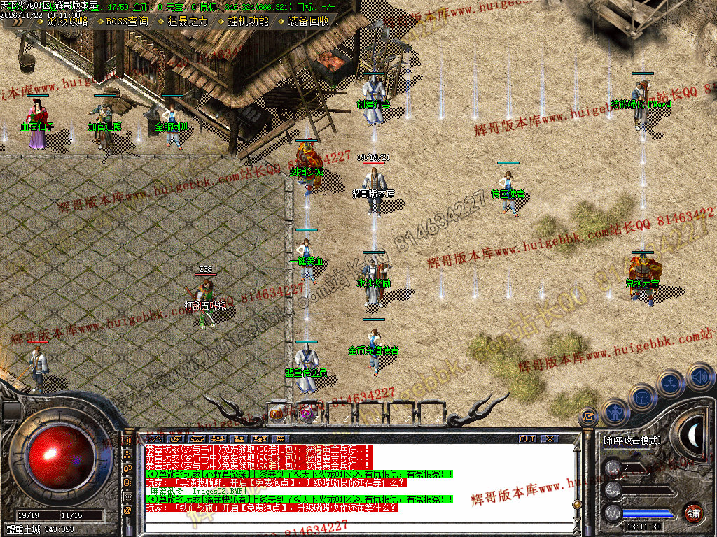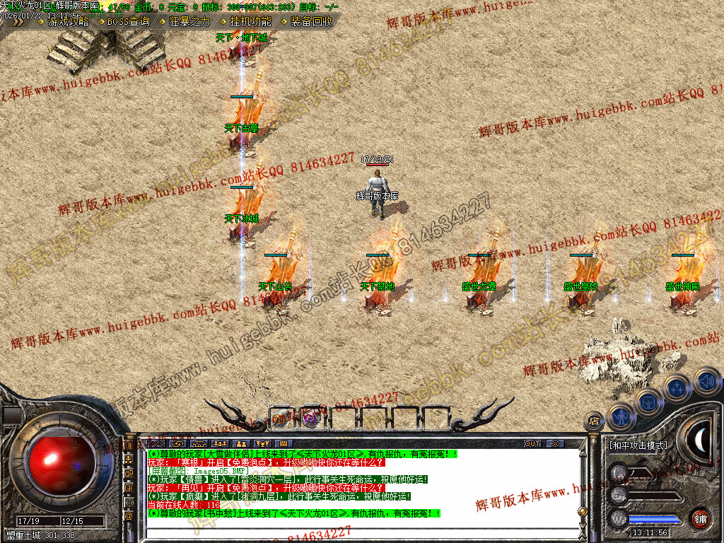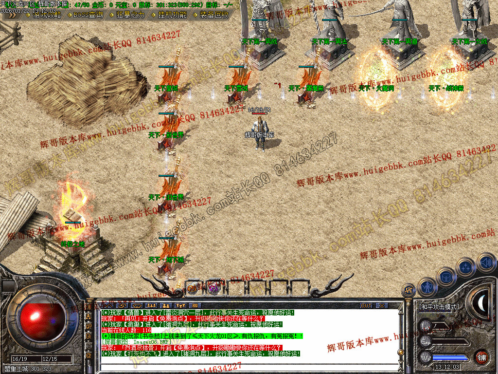 新区第二天晚20:00沙城复活点会刷新一只超级BOSS,必爆终极剑甲及大量金币(必抢!!!)