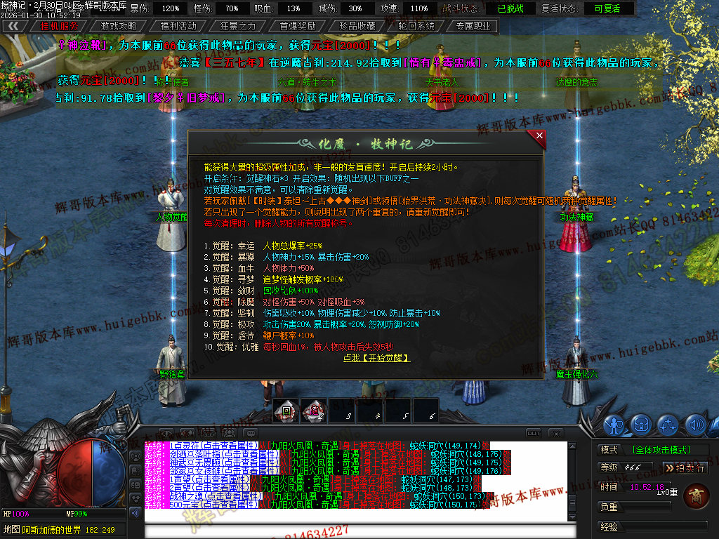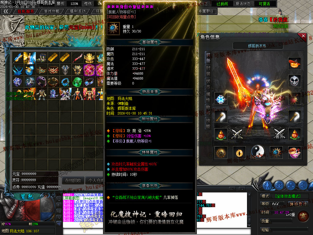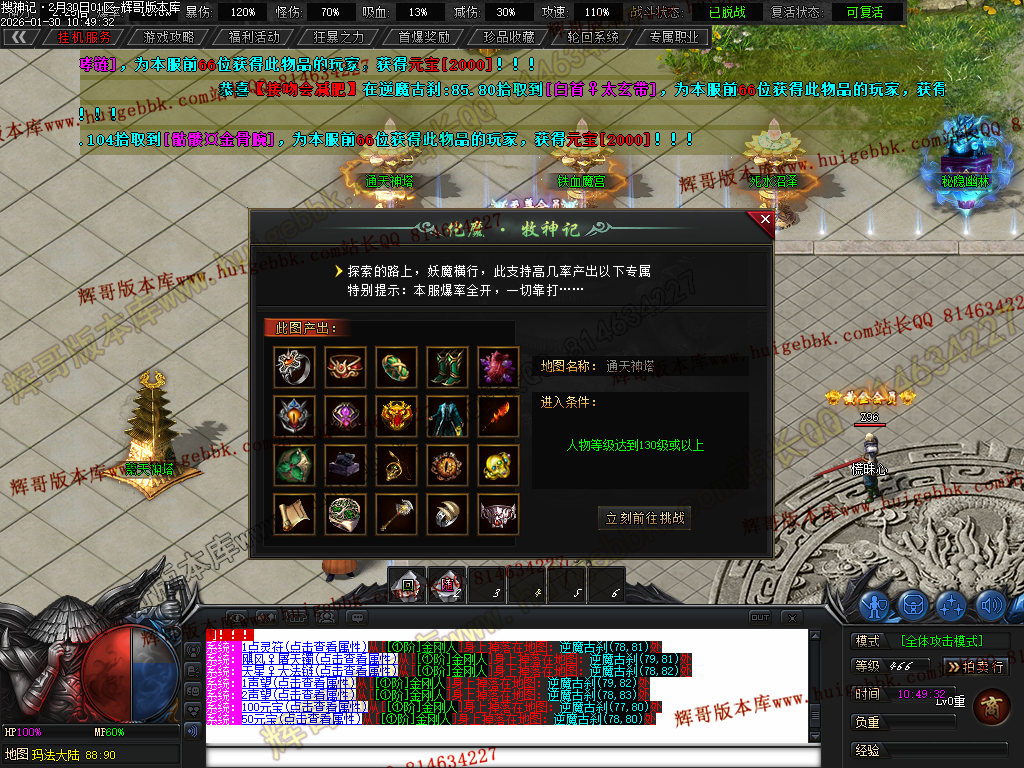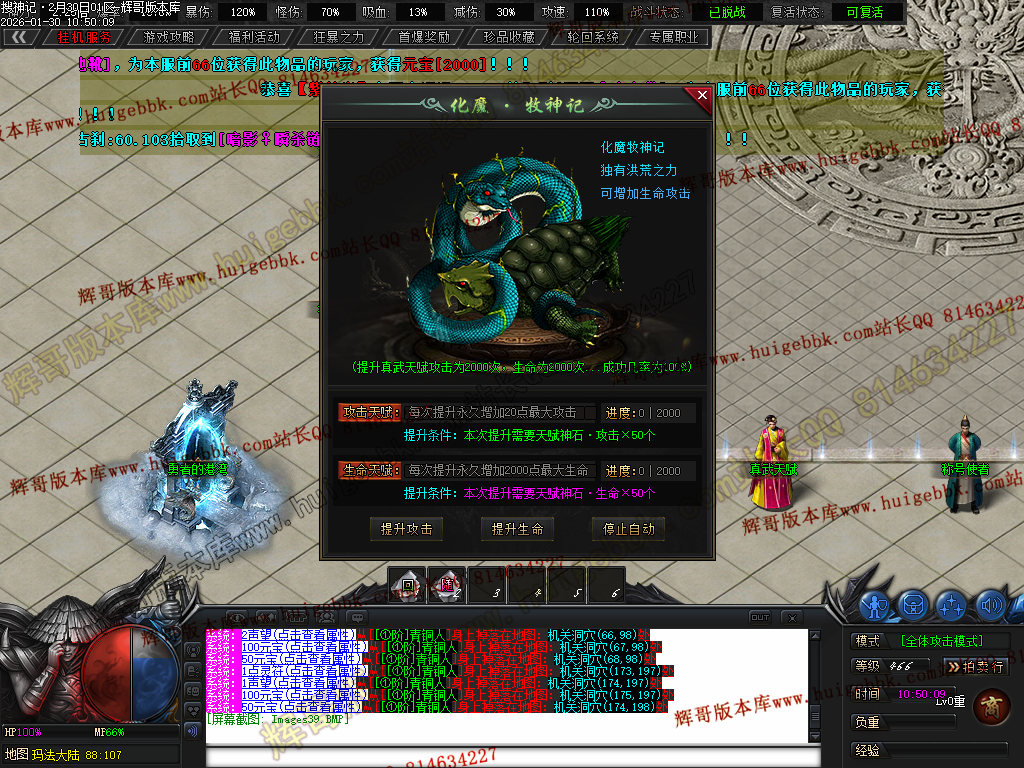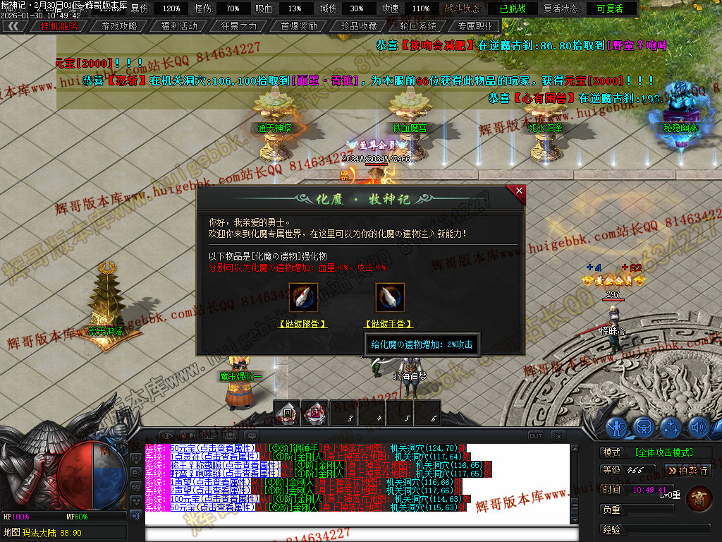 榜一大哥20元点券 (杀怪爆率+250% 攻击速度+30% 回收加成+50% 攻魔道+108 HP/MP+1200 领悟 魔法盾)