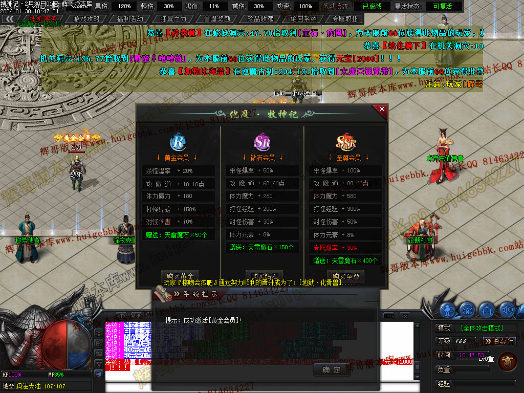 至尊会员 200充值点·(杀怪爆率+100% 攻魔道+ 88 体力+ 580 杀怪经验+300% 对怪伤害+ 50% 体力元素+ 8% 专属爆率+30% 赠送天雷魔石X400个)