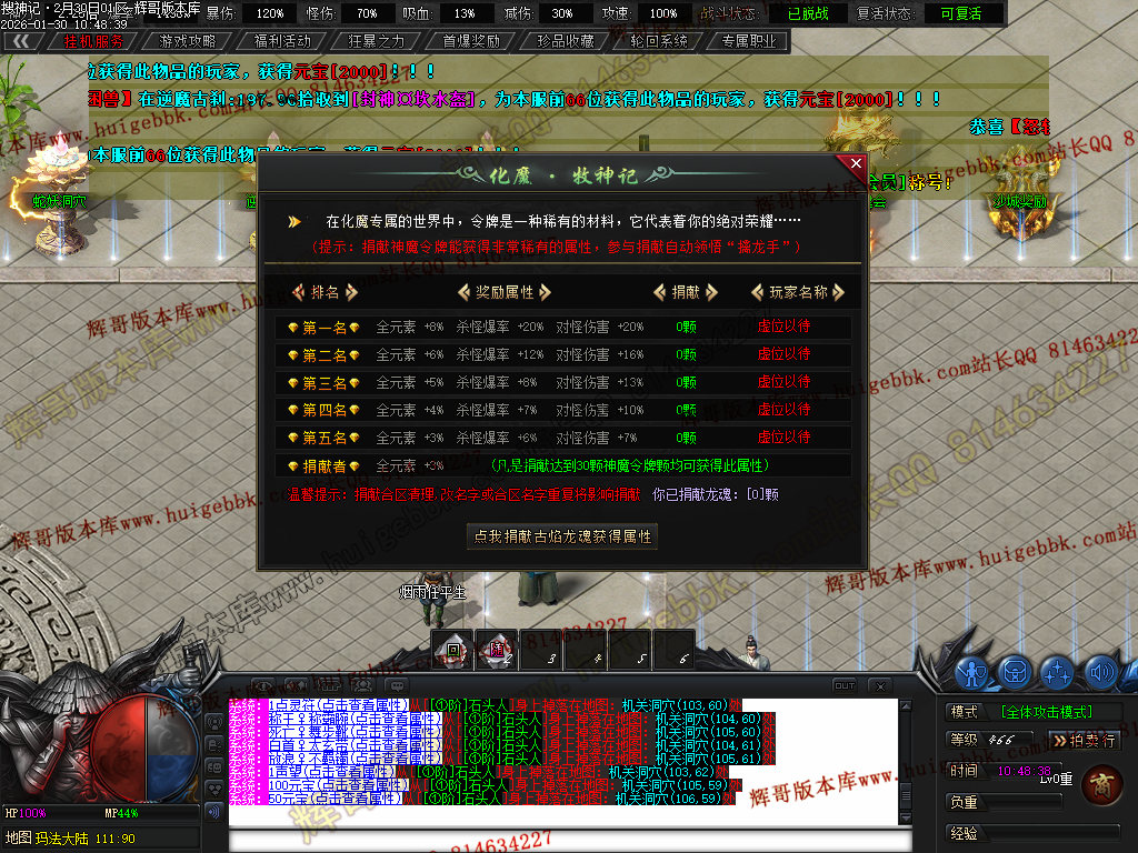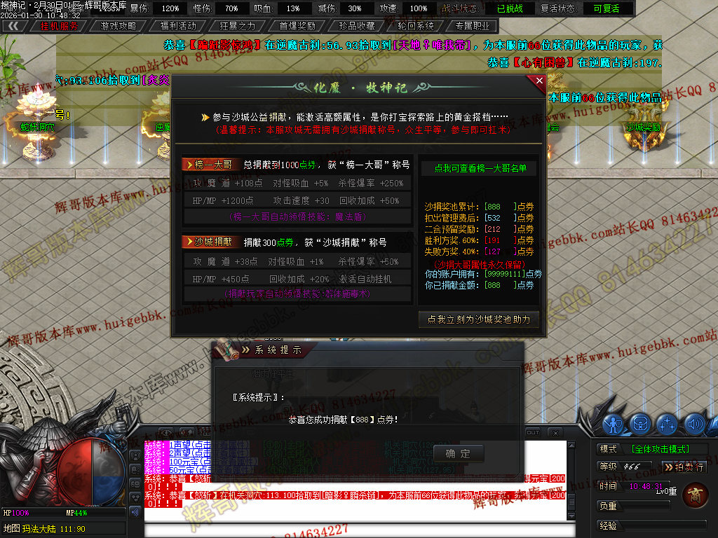 沙城捐献 6元点券 (杀怪爆率+ 50% 回收加层+20% 攻魔道+38 HP/MP+450 领悟·群体施毒术)