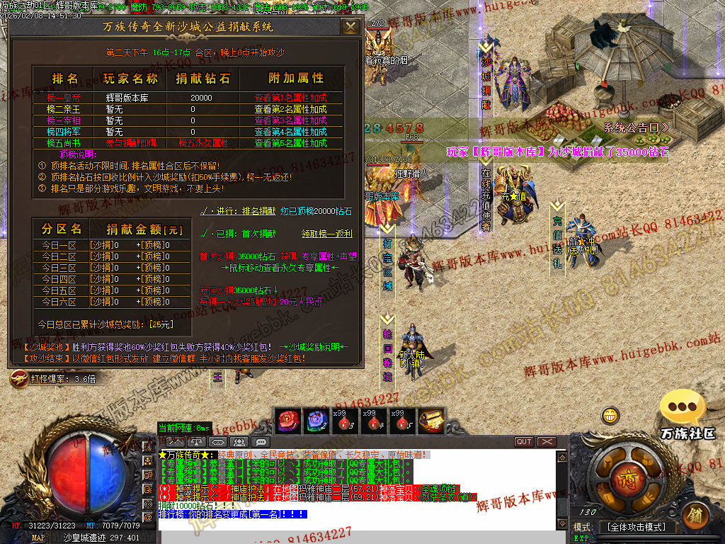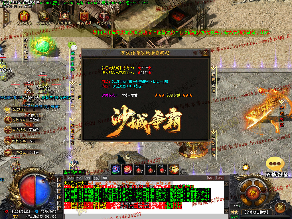 【攻城奖励】:新区首次拿沙奖励价值500元高等武器一把(武器保值可回收现金)+捐献红包奖励,老区奖励5万钻石!