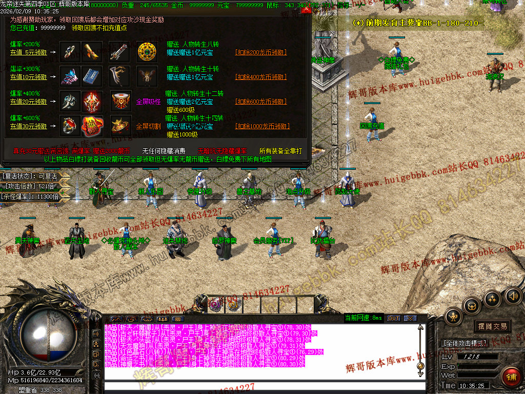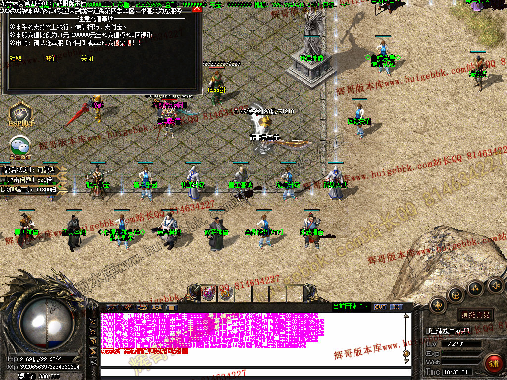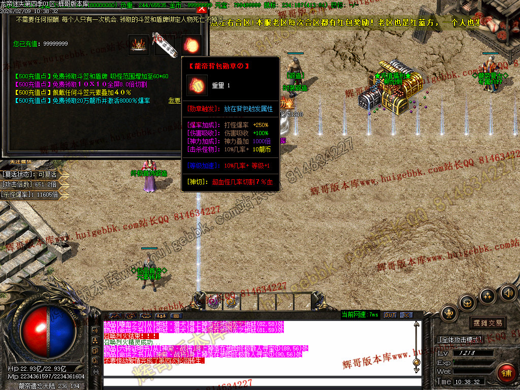 200元充值: 1、吸怪范围增加至30*30 2、5X5全屏4.0倍切割 3、领取50000龍币并激活2000%爆率 4、领取次终极绑定斗笠等级+2 5、领取【龍帝背包勋章④】四级背包神器