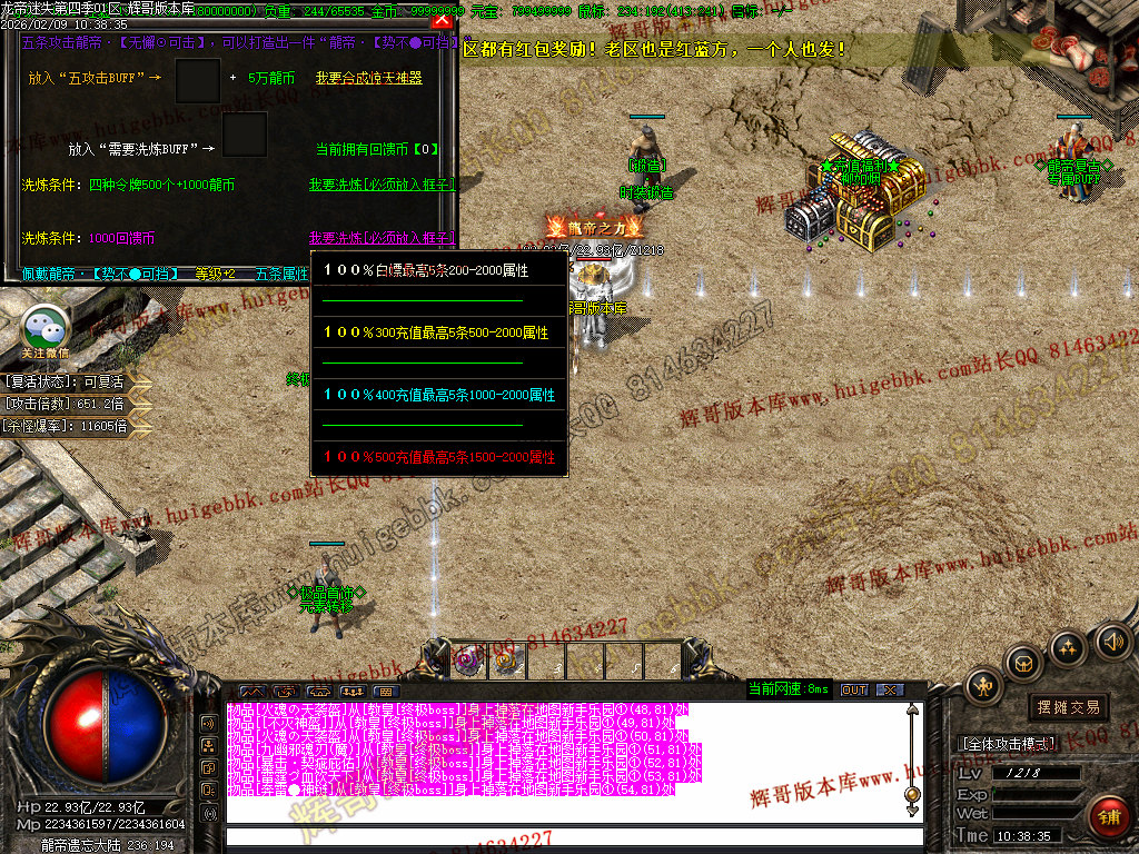 400元充值: 1、吸怪范围增加至40*40 2、7X7全屏6.0倍切割 3、领取100000龍币并激活5000%爆率 4、领取终极绑定斗笠等级+3 5、领取【龍帝背包勋章⑥】六级背包神器 6、鉴定BUFF保底五条攻击1000-2000