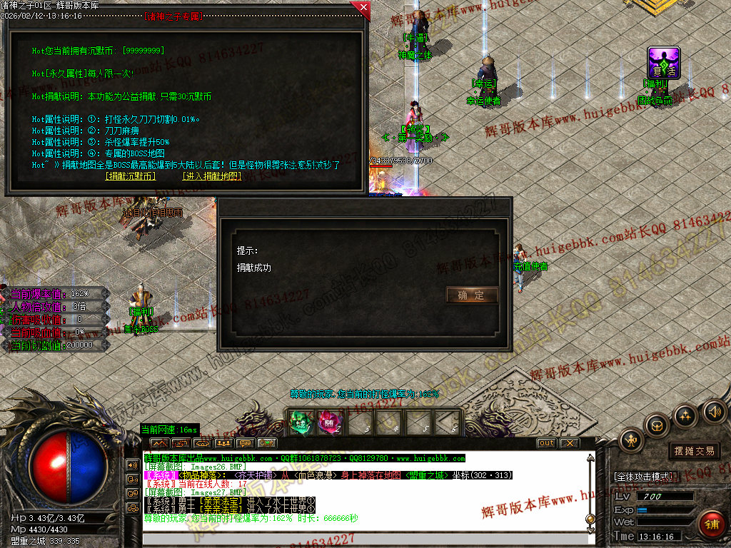 捐献使者:50%杀怪真实爆率、刀刀麻痹、刀刀切割Lv200以下的怪物1%最大血量、专属打宝地图(刷新全服顶级BOSS)