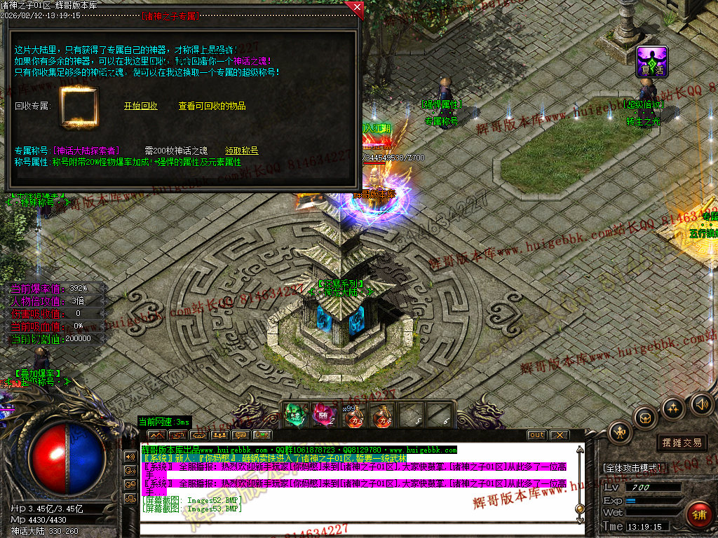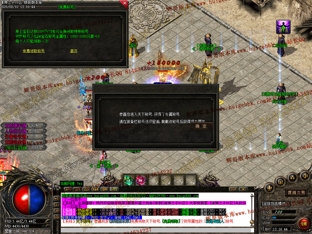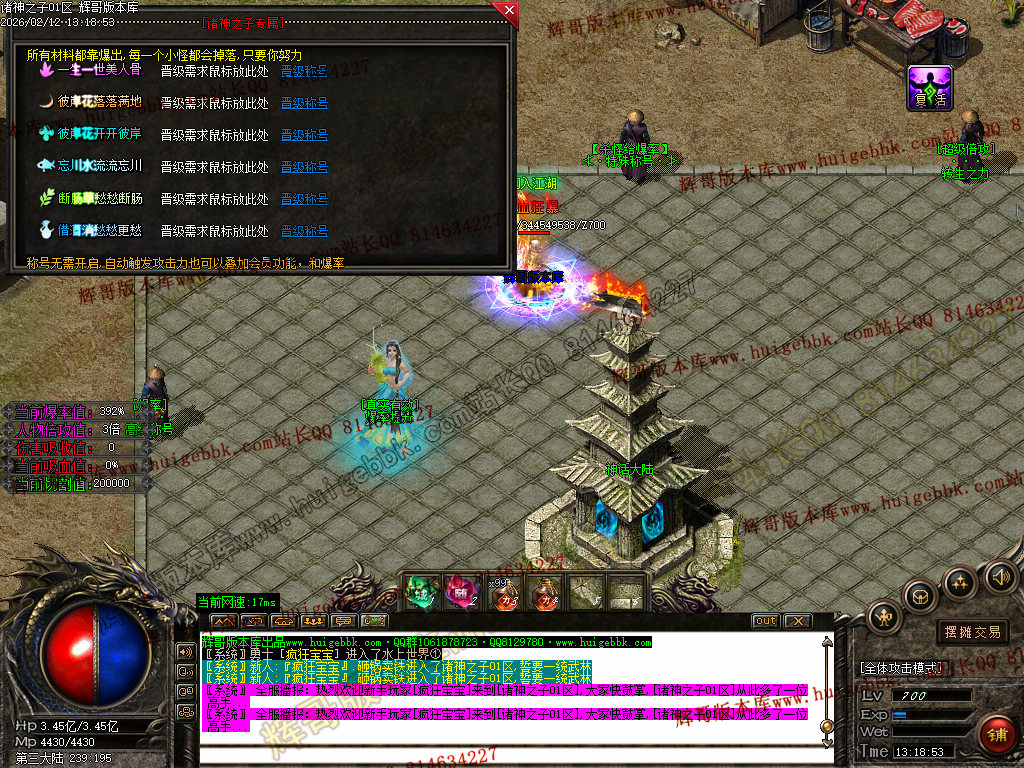 3、超级称号篇:神话之魂可以领取 赠送50%爆率+强悍属性元素(称号增加你的爆率)