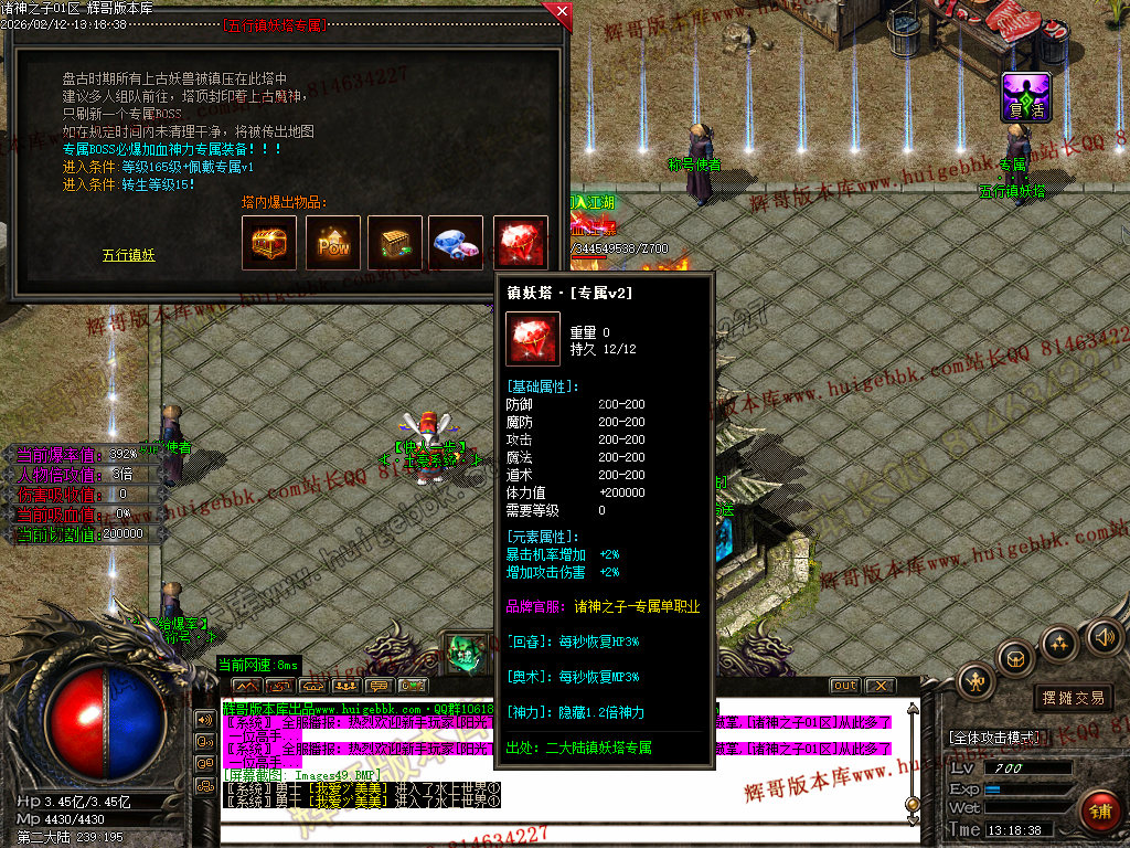 12:专属装备:每个大陆都有镇妖塔出现,击杀BOSS将获得神力倍数的装备和每秒百分比回血。击杀之后将自动佩戴人物身上!