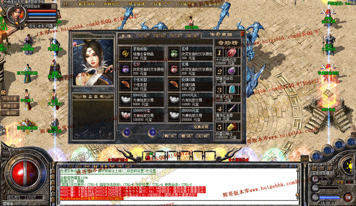 (*)开区第二天攻城时21:15-21:55之间,在[沙城复活点]每隔10分钟发放大量元宝。