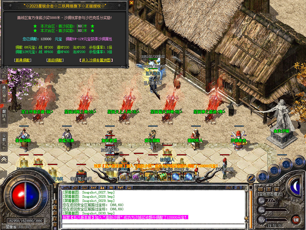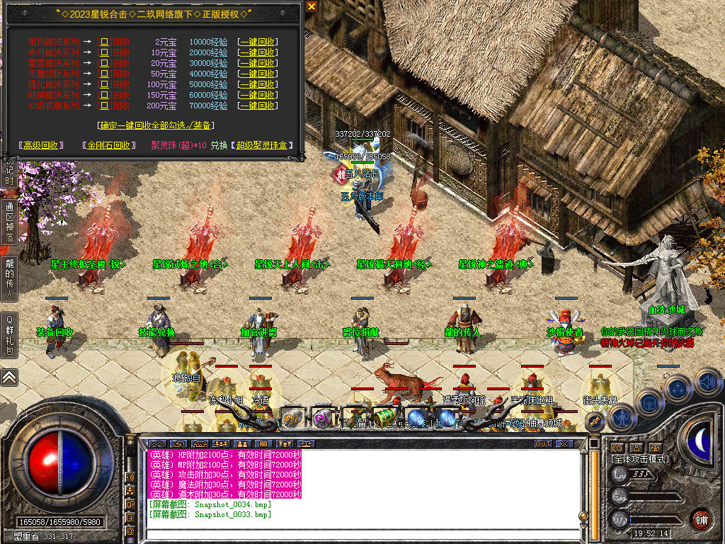 1★.最高消费: 200可获得刀刀打BOSS上毒+1件爆率时装+双运九武器+四倍练级+永久回收宝箱一个,散人可通过打元宝庄园合成爆率时装