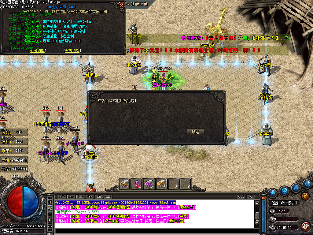首杀、首爆及无限首杀奖励超多元宝、先到先得、本服共有3个大陆。