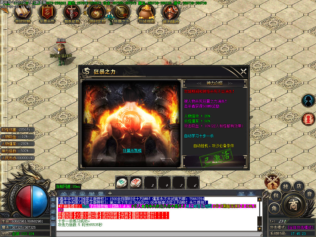 游戏介绍:第二条线路正常线路24小时暴率 怪物血量是一线路的60% 刷怪数量增加