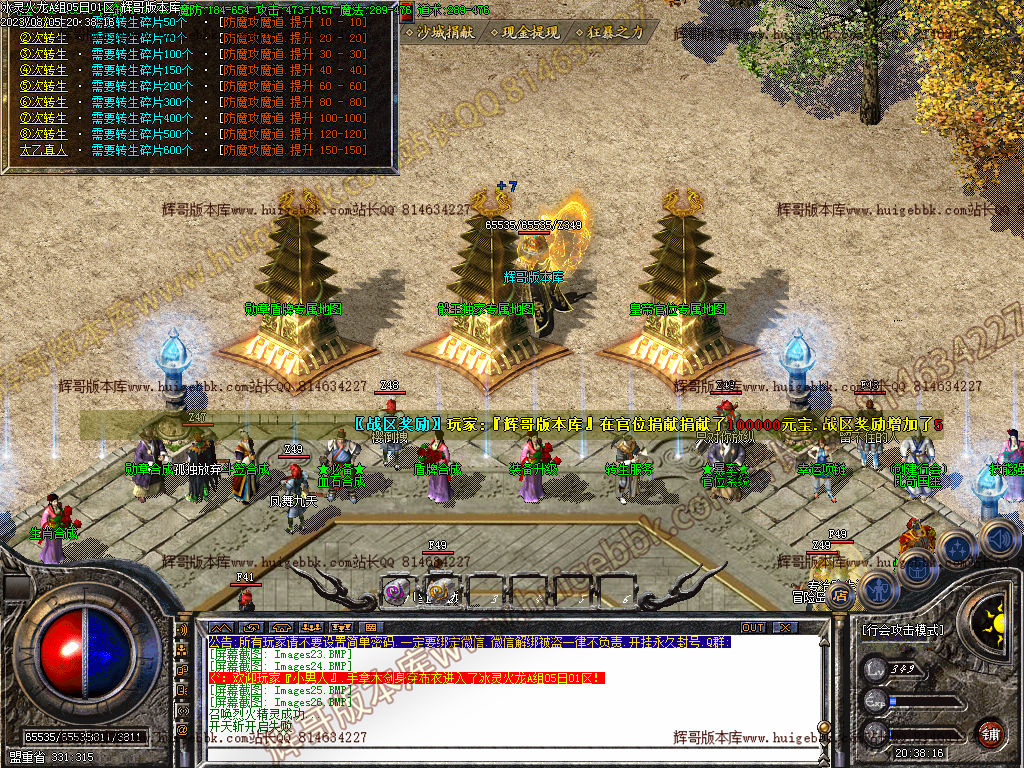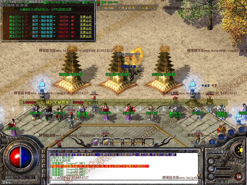 公告:服务器每天开区时间为13:00 16:00 19:00 22:30 1区增加20%暴率 2区增加40%暴率 3区增加60%暴率 4区增加80%暴率 额外暴率合区取消