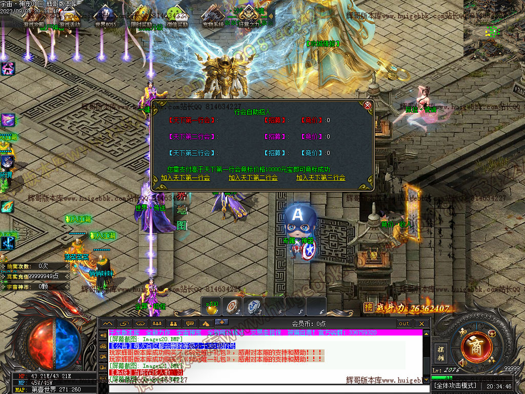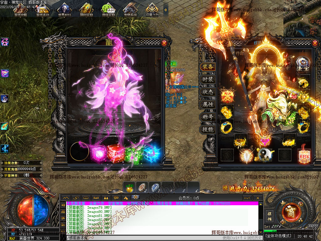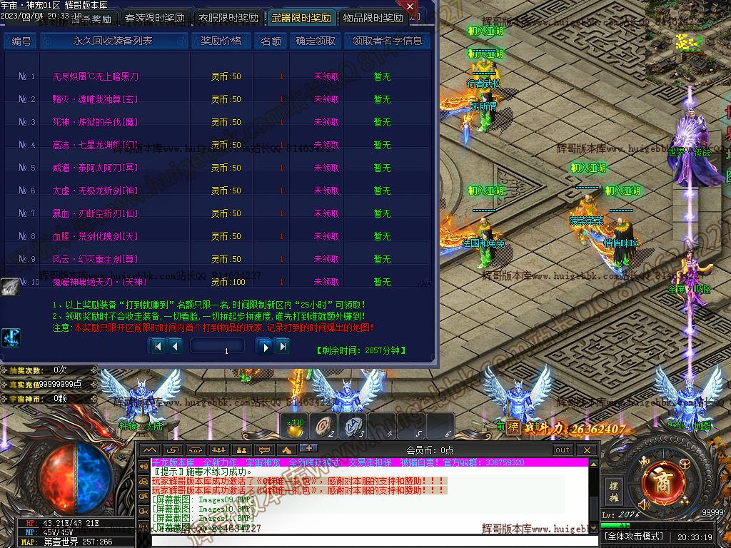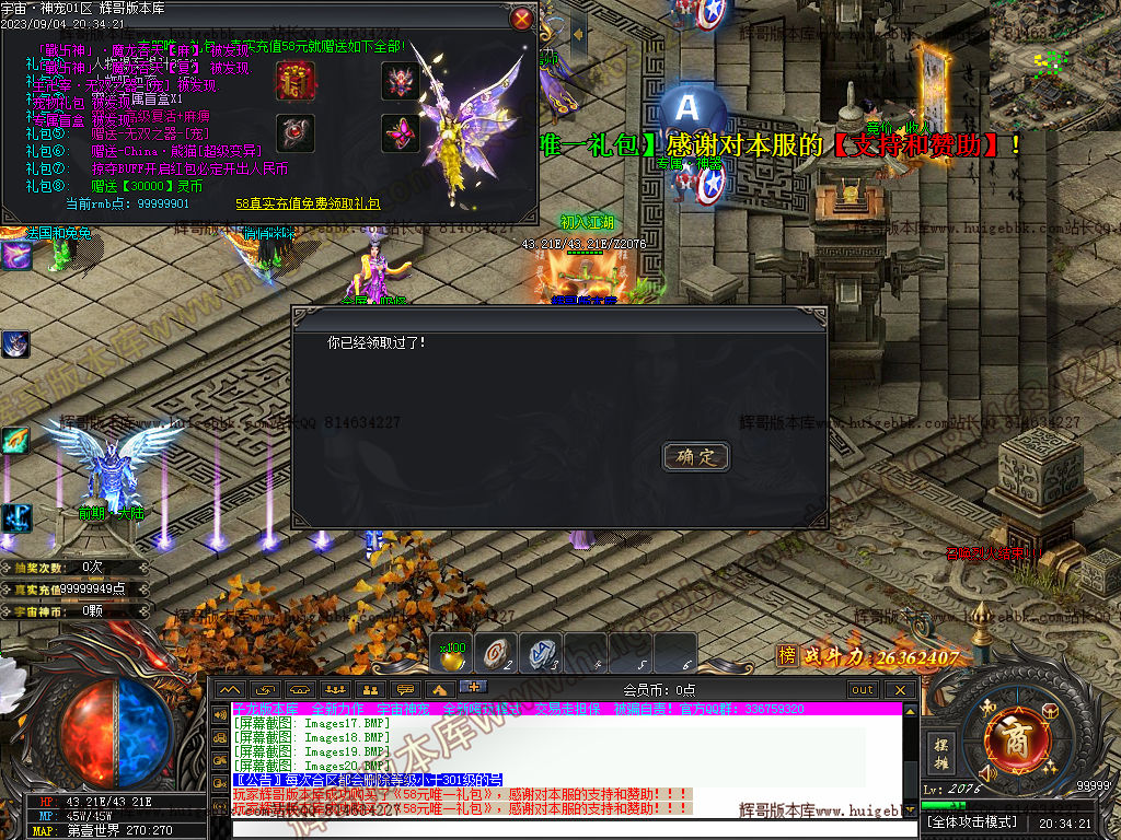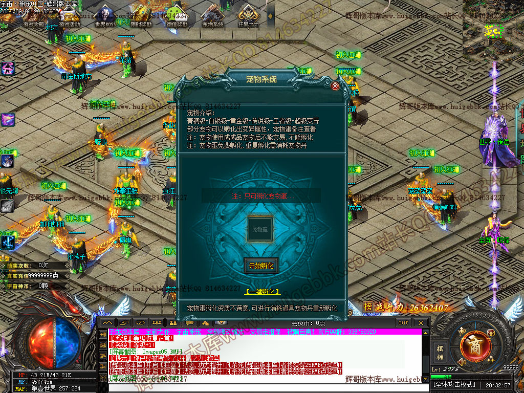 2.增加大背包160格,Q群免费激活,1米礼包赠送宠物改为鸿蒙天尊。