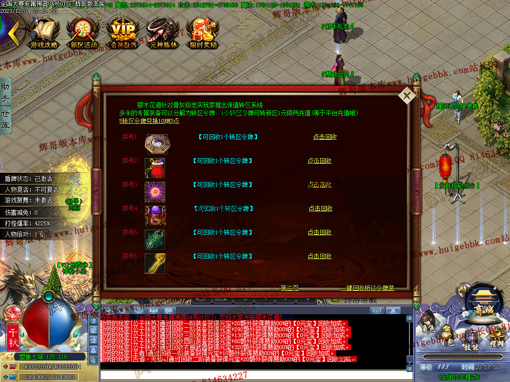3、新增自助转区令牌NPC我,玩家打到的转区令牌就可以转区,1转区令牌=新区1米银两充值;