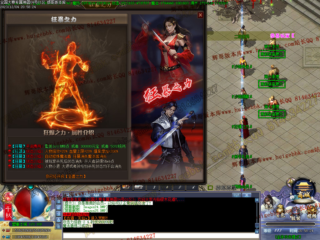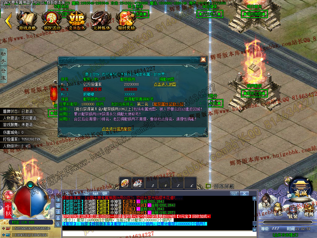 2、提高了充值玩家的爆率加成。充值100米银两,加500%爆率(5倍)。充值500米银两,加2500%爆率加成(25倍),以此类推。上不封顶。。(全部为真实爆率。激情服爆率必须高点)