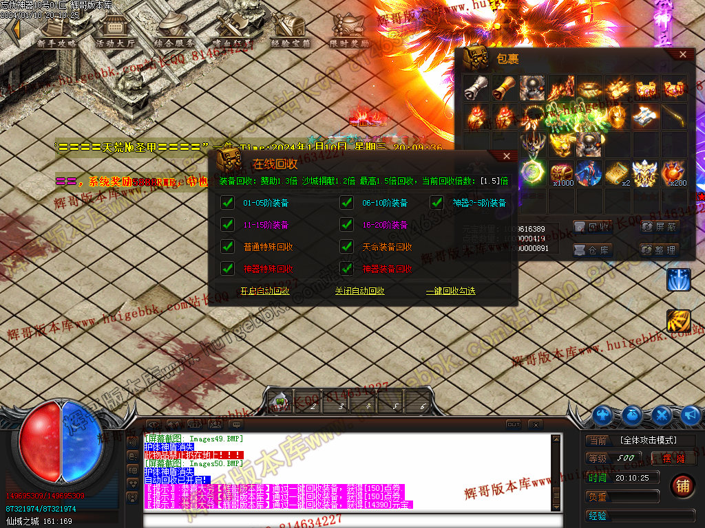 本服为方便散人玩家发展 新增一键装备回收米功能 ,充值点100以上可进行一键装备回收米