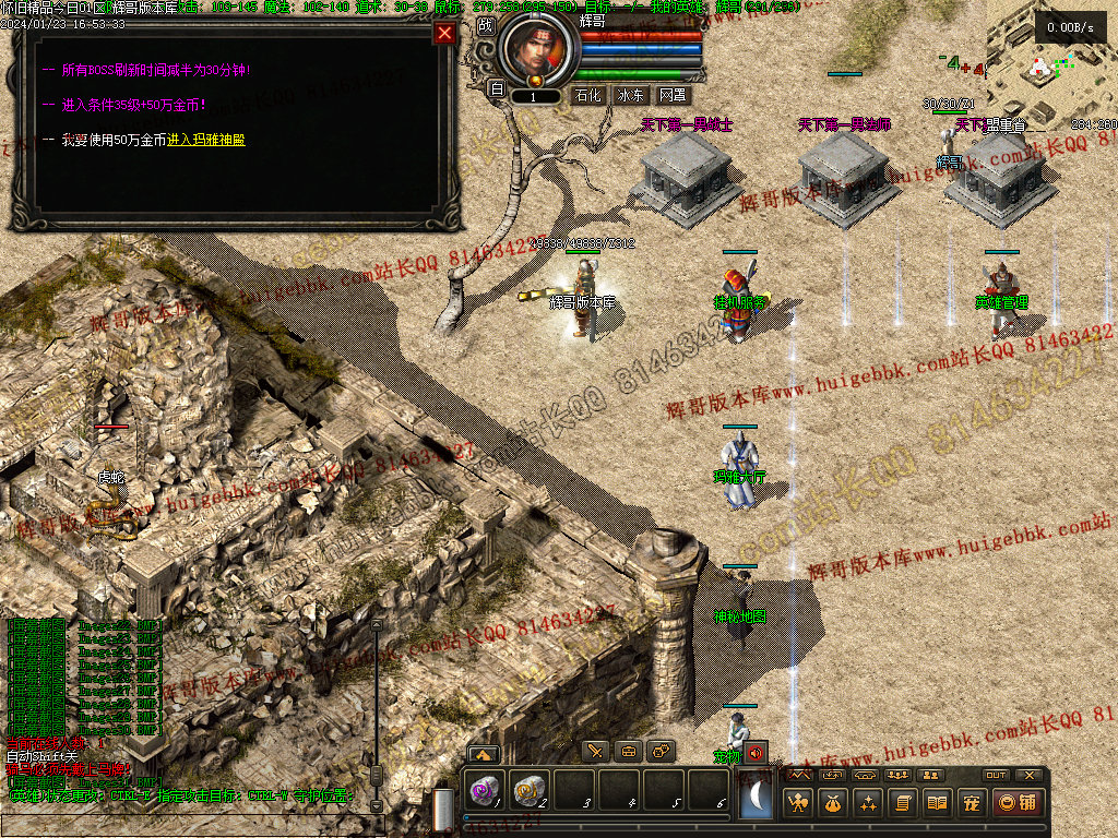 4 老干部活动中心 土城大树方向进入 人物背包服务列表里面有自助BOSS刷新 进入老干部活动中心,可以金币刷新BOSS(为了方便玩家打神物)玩家量力而行 多数BOSS为远程攻击 金币只有回收或者打首爆获得 没任何充值方式