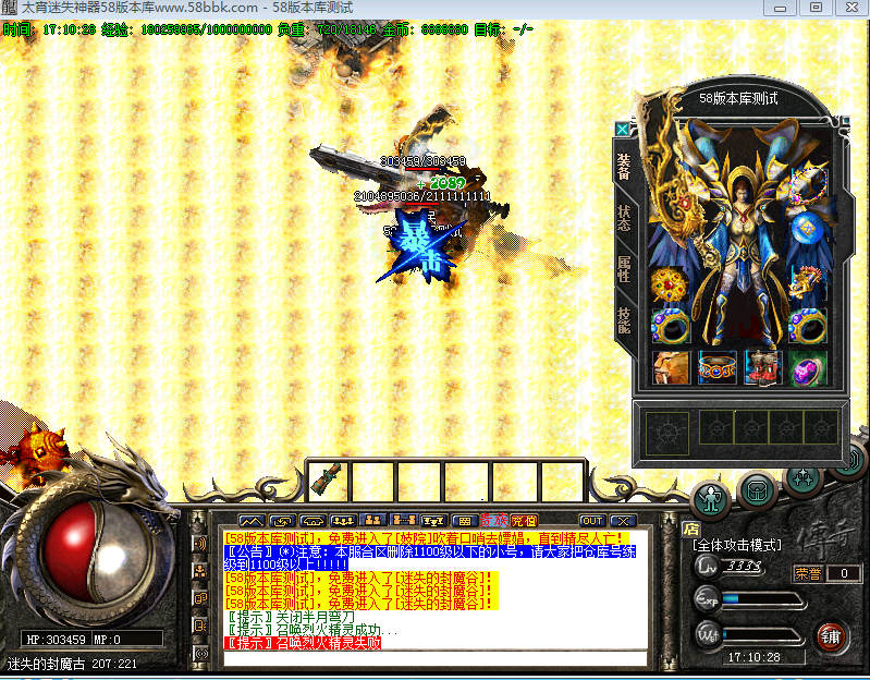 【版本介绍】:本服装备全部有爆.经过测试,属性绝对不冲突,攻击不爆,全身终极最高神力可达108倍.血量最高1.5亿.一刀烈火上E血