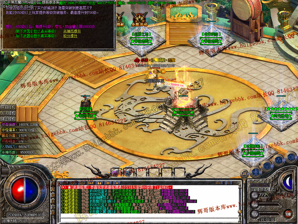 然后去新手地图打元宝去土城中间的“泡点NPC”开启随身泡点,650进第二大陆,高级地图以后每半小会刷新2只终极BOSS,有几率出终极装备!