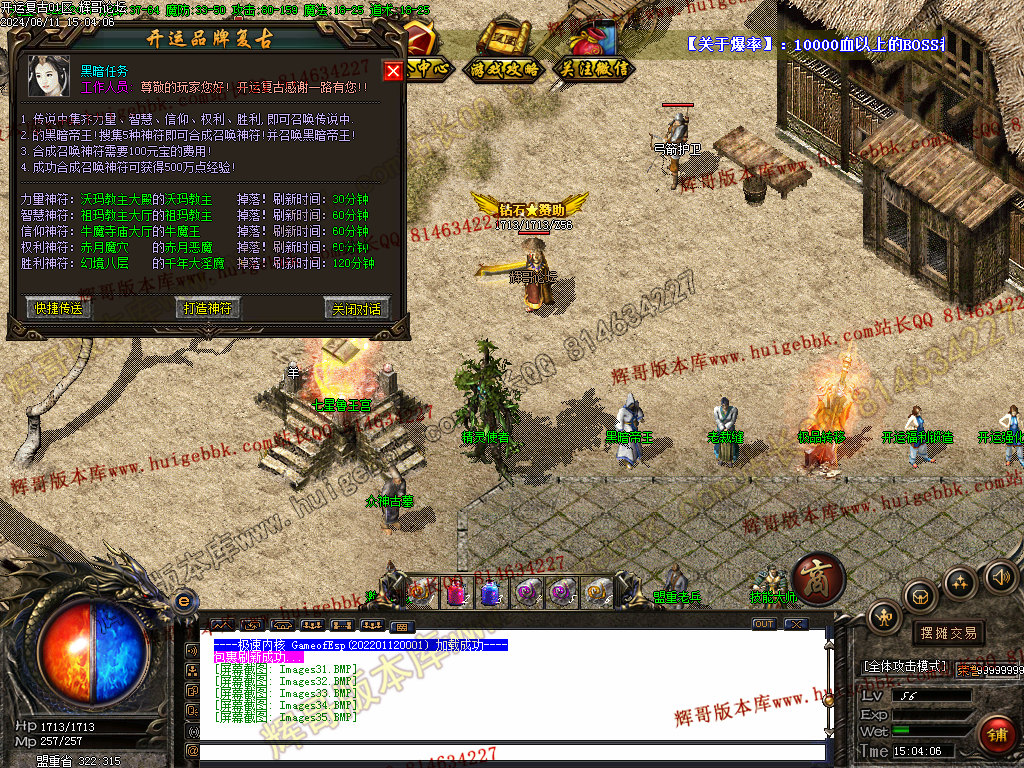 【关于爆率】:10000血以上的BOSS都有几率爆出终极装备,通天神塔为120分钟刷新一次,沙宝阁怪物60分钟刷新,40级新衣服爆率为1/50、(屠龙)爆率1/1000、(开运赤月)爆率1/800、(开运衣服)爆率1/2000、(开运屠龙)爆率1/2000、