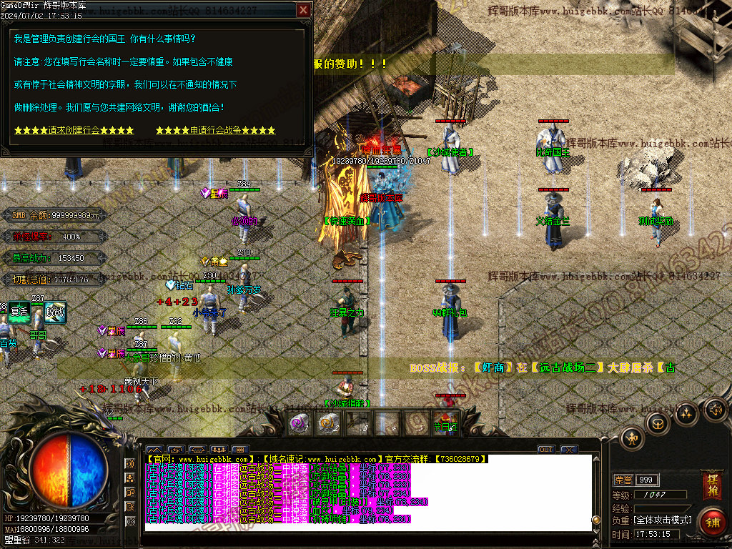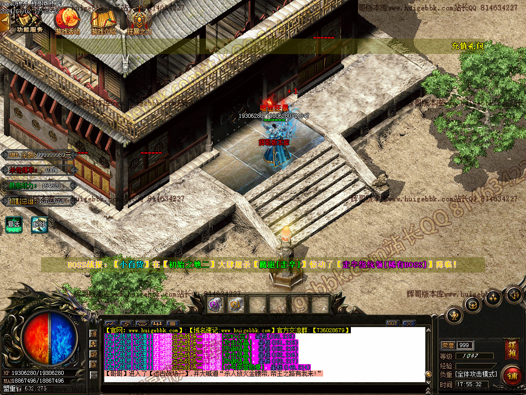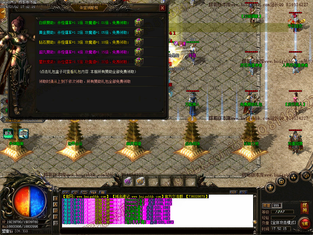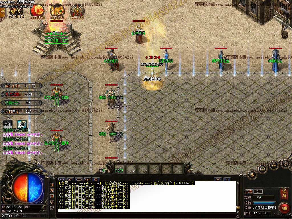 游戏最左上角的功能服务:可开启自动吃元宝,查看战力,远程荣誉捐献及查看BOSS首充功能等;怪物屠杀大师里面达到条件即可免费领取高级武器和BOSS召唤石头(前期土豪必打)