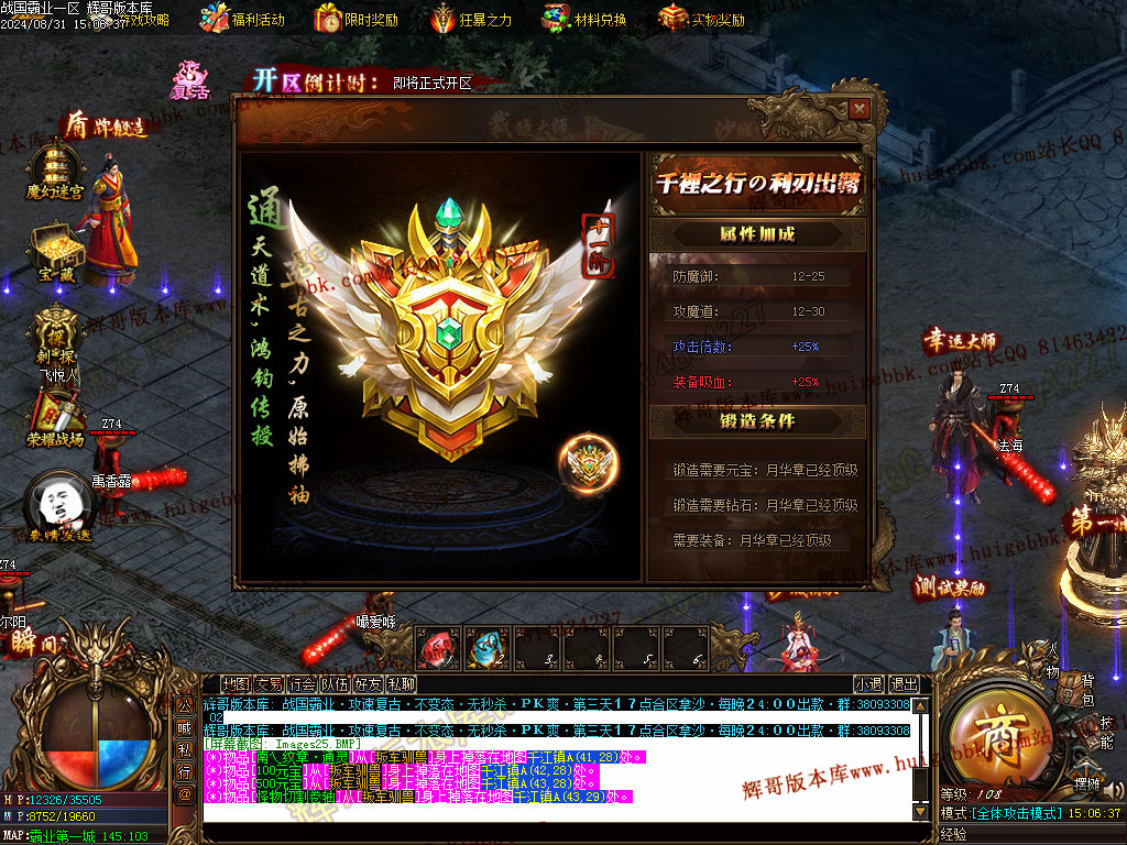 终极勋章:合成终极需钻石150万+元宝150万,触发刀刀吸血258+攻魔道25%+护身属性。
