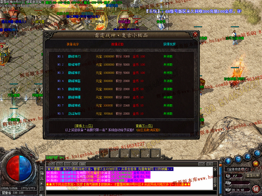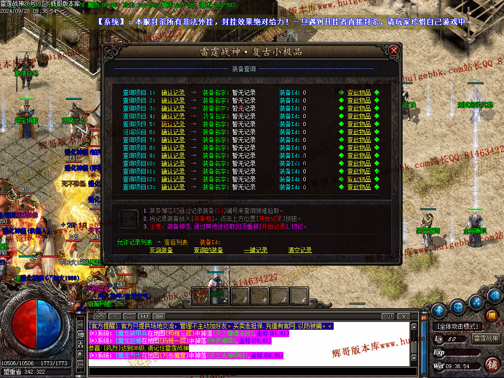 本服长期开放,1W2血量以上所有怪物可以爆出本服所有装备,这不是一天闪服,装备等级需各位努力,本服配有自动封挂系统,请大家共同营造一个良好的游戏环境,请勿使用非法程序,一经发现,零容忍。祝大家游戏开心。