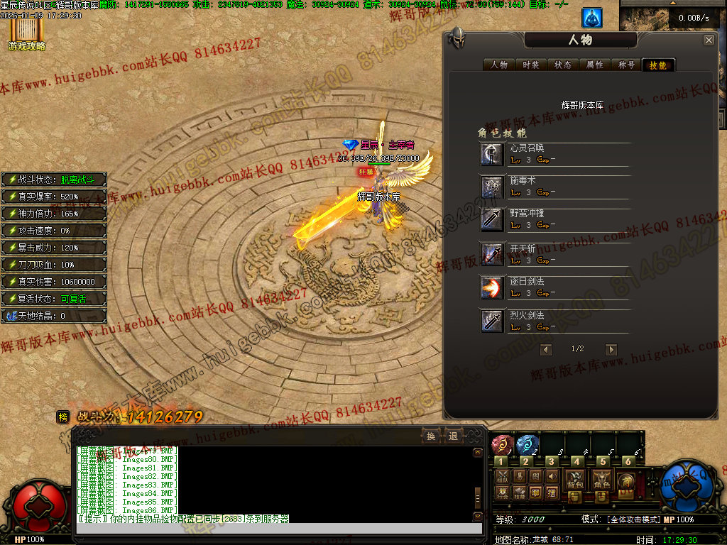 主要挂机操作时使用此技能[可内挂设置自动练功或攻击魔法中释放]免费领取虎王啸[全屏吸怪]效果:全屏吸怪范围65x65.自带红绿毒.