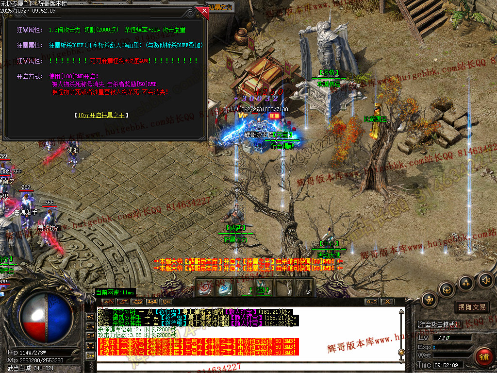 狂暴:100RMB=10元RMB点充值 开启 狂暴 刀刀麻痹怪物+40%攻速(全服唯一攻速) 就可以 可打全服所有怪