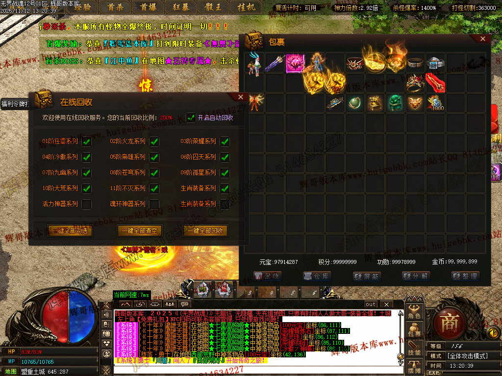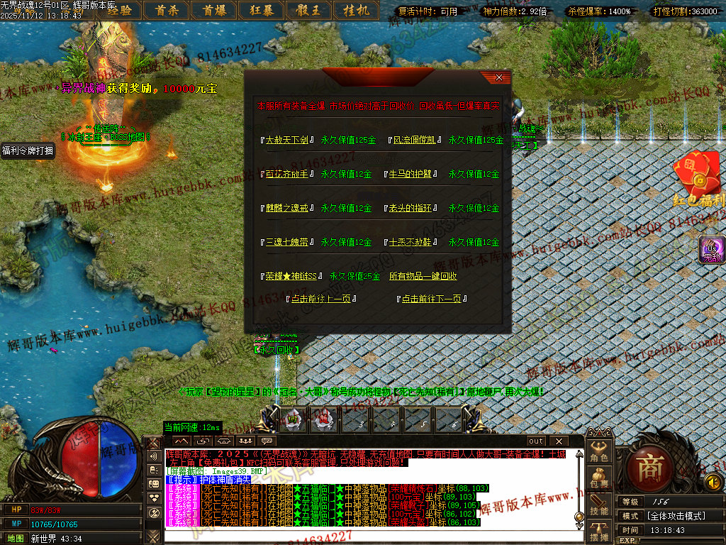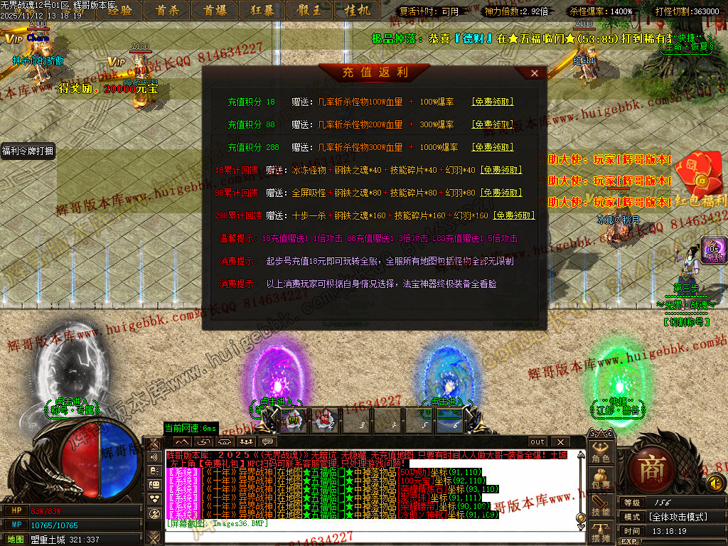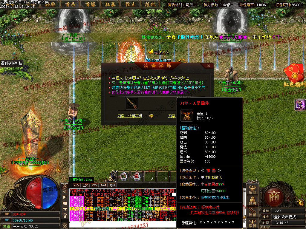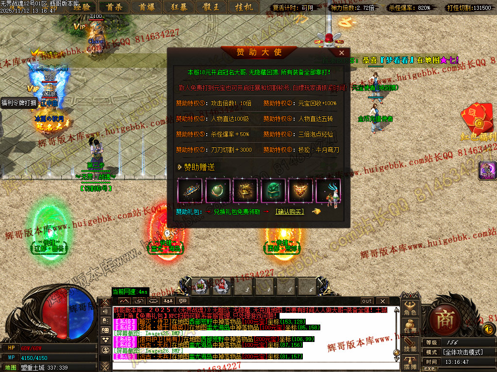 赞助礼包88元:领取全屏吸怪技能。刀刀冰冻怪物。几率斩杀怪物200W血量,300%暴率,1.3倍攻击。