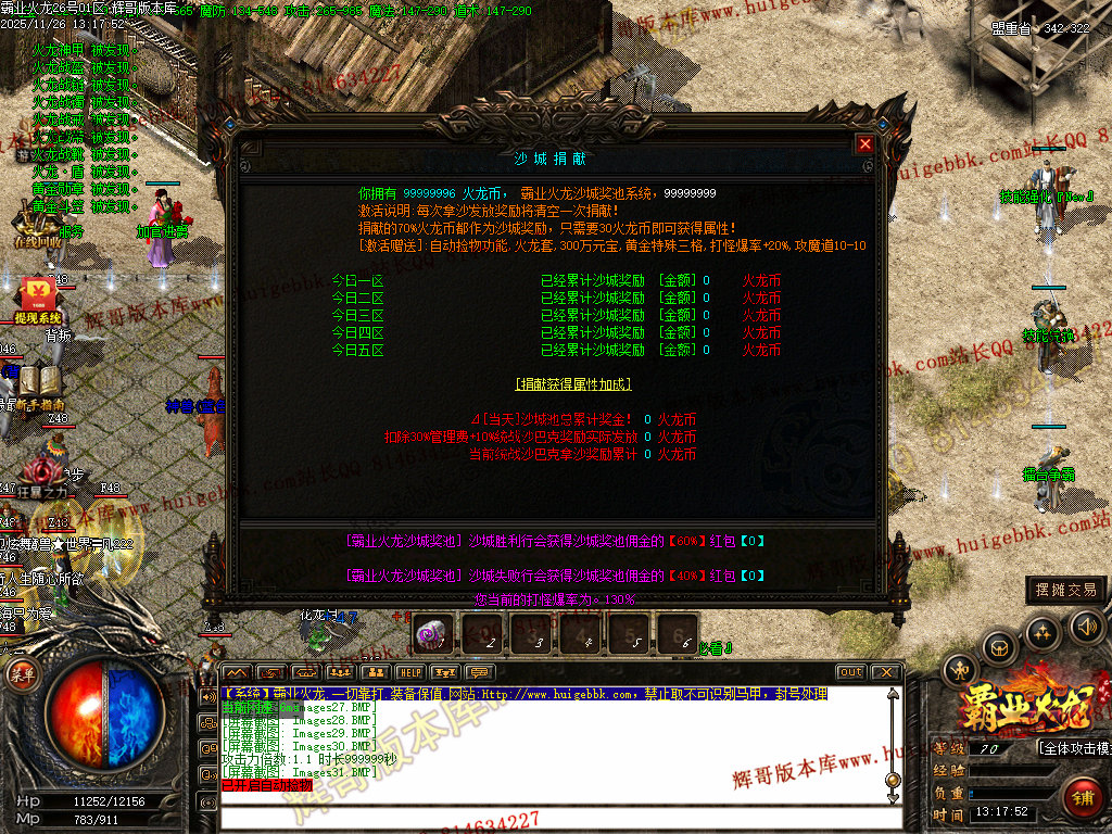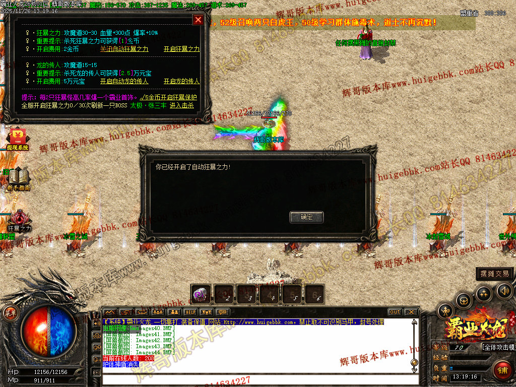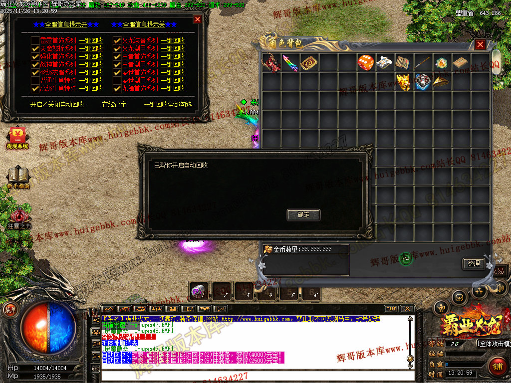 开启沙捐后获得基本装备火龙套,带自动捡物,开启狂暴后开启自动回收,