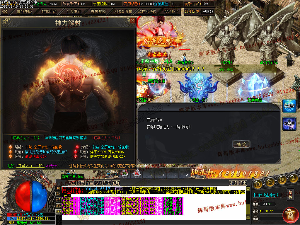 激情一档:充值32大米开启狂暴十级+盘古之力赠送:5倍元宝回收+1000倍爆率+10倍神力+全屏吸怪