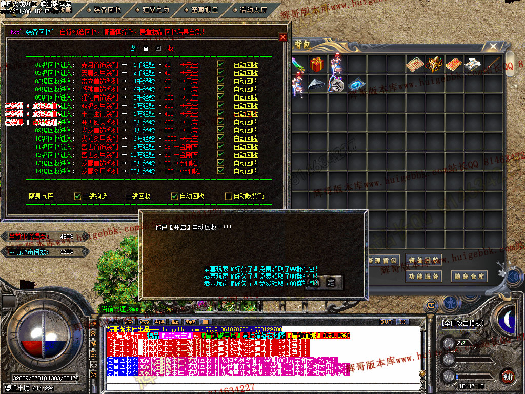 【版本介绍】:1.80火龙复古传奇版本,终极剑甲全部靠打,地图多BOSS多,自动回收捡物
