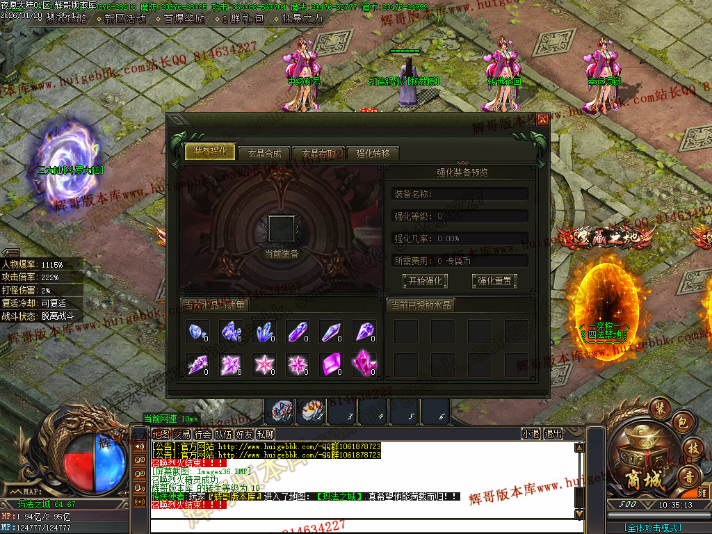 本服的强化功能需要1-12级玄晶 从三大陆开始会爆出 八大陆爆出11-12级玄晶 每件装备可以强化16次(16级强化增加1200攻魔道!) ,全身加起来会强狠多哦!3-7大陆爆出1-10级 11-12级玄晶需要在土城小安全区用装备兑换(土豪可以直接在商铺卖)