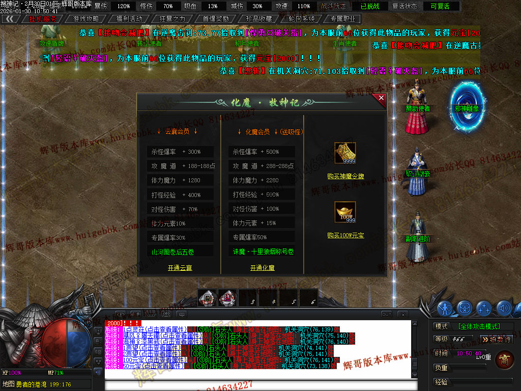 至尊会员 200充值点·(杀怪爆率+100% 攻魔道+ 88 体力+ 580 杀怪经验+300% 对怪伤害+ 50% 体力元素+ 8% 专属爆率+30% 赠送天雷魔石X400个)