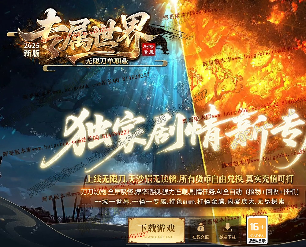 ★游戏介绍★:2026全新剧情新专属,上线无限刀,免费(捡物+回收+挂机),一城一世界,一怪一专属