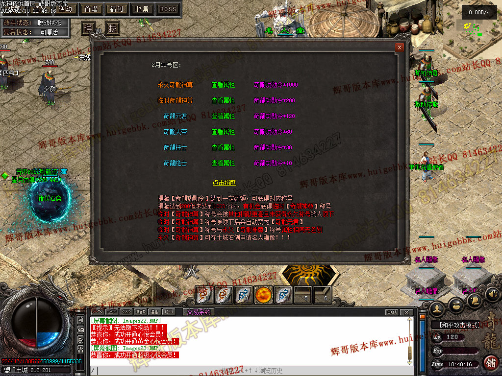 领取终级捐献称号+永久回城石、随机石+十步一杀