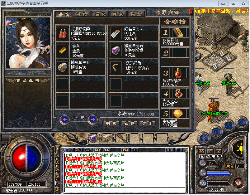 元宝比例:1:300W 100金刚 80灵符 点卡:送100% 网银:送100%