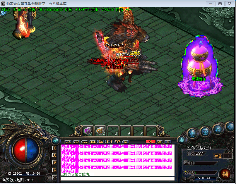 【版本说明】: 無雙第Ⅱ季独家更新,长久稳定,激情火爆,上线加入战斗吧!【充值比例】: 元宝比例:1:10000,网银赠送100%,电话卡赠送90%!【游戏介绍】: 本服所有装备全部靠打,所有BOSS均有终极爆率,屌丝也可以逆袭。【游戏介绍】: 各种材料极其珍贵,靠长期积累才能称霸游戏,绝对不会充钱就没有乐趣!【游戏介绍】: 各种新地图BOSS很有挑战性,再也不会是那种低能服!【游戏介绍】: 长期运营封死外挂,还玩家一片净土,让您感受到什么才叫游戏!【游戏介绍】: 独家全新活动系统,时间安排合理,散人激情无限!【攻沙介绍】: 新区拿沙奖励500万,老区天天激情奖励300万。【职业介绍】: 本服三职业平衡,属性合理,让您的PK更加激情。【游戏介绍】: 各种活动乐翻天,散人玩家同样可以获得高额元宝!【防骗提示】: 游戏内无任何管理,聊天只要牵涉汇款一律是骗子!