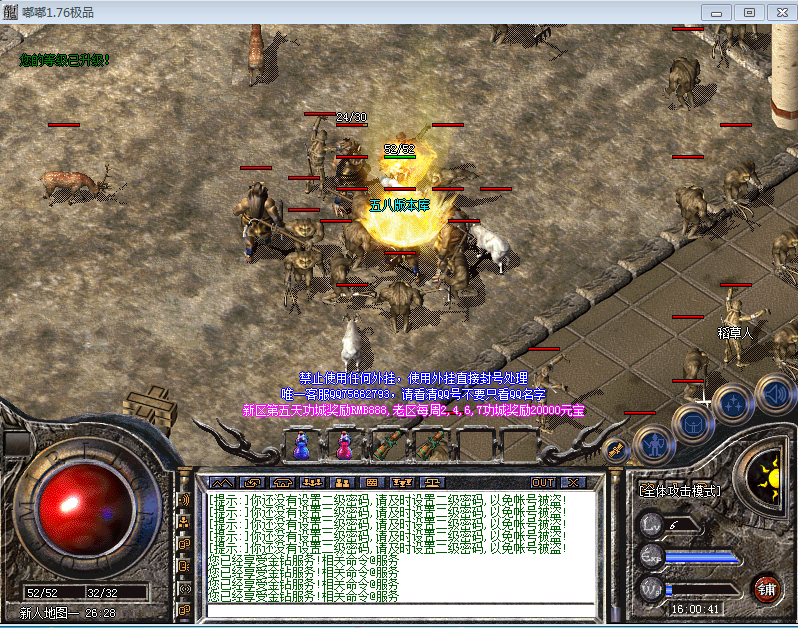 嘟嘟传奇1.76小极品心动复古版本|据点争夺战|神力护身|东郊皇陵|鲜花专属|行会争霸【LEGEND引擎】嘟嘟传奇1.76小极品版本介绍版本介绍独家1.76小极品版本,游戏难度:★★,本版基本保持盛大官方1.76重装上阵内容,以小极品为特色,各大地图大部分直接传送,对于普通玩家来说,此版上手容易,等级与普通装备均不是很难,乐趣在于极品+1+2+3!游戏定位本版本定位为1.76小极品特色版本,但要比1.76复古版轻松,比元宝版快餐版1.76传奇耐玩,比市面防盛大版1.76复古传奇更具特色!奖励规则新区第五天攻沙奖励20000元宝+1000,合区后每逢周日奖励800。开区规则从2014年5月后开区进行了调整,每周一和周四的19:30开放新区(特殊情况例外),每个新区连续2天广告进行宣传,100%人气火爆! 人物幸运商城有售普通祝福油,武器幸运值最高可喝到7。幸运项链可爆可寻NPC打造,幸运9好搞! 魔法技能1.本服35级以前技能在你达到相应等级时,系统全部自动赠送! 2.35级技能书可在尸王殿内爆出,每10分钟刷新一次! 3.着重调整了道士毒符的威力,40级出3级强化神兽,44级出7级! 4.法师44级可以招出900勇士! 5.本服无4级技能,完美仿盛大1.76版本! 游戏命令「加入门派」: @加入门派「退出门派」: @退出门派「游戏帮助」: @帮助「会员服务」: @服务「千里传音」: @传 (每次50元宝,等级需40级)「行会联盟」: @联盟「开始联盟」: @请求联盟「取消联盟」: @取消联盟「夫妻传送」: @夫妻传送(必须提前打好@允许夫妻传送)「师徒传送」: @师徒传送(必须提前打好@允许师徒传送)「仓库解锁」: @解锁(仓库密码开锁命令)「仓库开锁」: @开锁(解除仓库保护模式命令)「仓库加锁」: @加锁(锁定仓库密码)「仓库密码」: @密码(给仓库加密码)「修改密码」: @修改密码(修改保护仓库的密码)「清除密码」: @清除仓库密码「注 意」: 仓库密码设置后,需小退才能成功! 装备爆率35级新书:爆率很高! 难度:☆沃玛装备:爆率不错! 难度:★袓玛装备:爆率适中! 难度:★☆赤月装备:爆率一般! 难度:★★☆40级衣服:爆率一般! 难度:★★☆怒斩武器:爆率一般! 难度:★★☆幸运项链:爆率一般! 难度:★★☆屠龙霸者:爆率极低! 难度:★★★★ 装备出处屠龙出处:暗之赤月恶魔,暗之地藏王,暗之牛魔王,祖玛教主怒斩系列:暗牛,牛魔王,地藏,暗之地藏,暗之赤月魔,祖玛和黄泉教主六新衣服:重装使者,各大新衣服BOSS荣誉勋章:圣域BOSS,暗之地藏王赤月首饰:双头血魔,双头金刚,赤月恶魔,暗之赤月恶魔,暗之地藏王祖玛装备:极品祖玛,牛魔将军和祭祀,白野猪等各类大小BOSS沃玛装备:普通祖玛,极品祖玛,沃玛教主,沃玛卫士等各类大小BOSS更多游戏攻略与介绍请查看土城“新手攻略”NPC