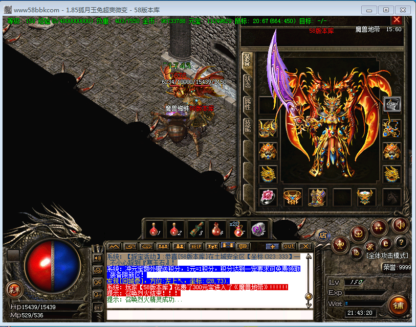 游戏介绍③ >> 大小怪物都可以暴元宝,金刚石,杀死boss还可得到声望值,物品丰富,不会乏味,只要你肯花时间不花钱照样当爷!