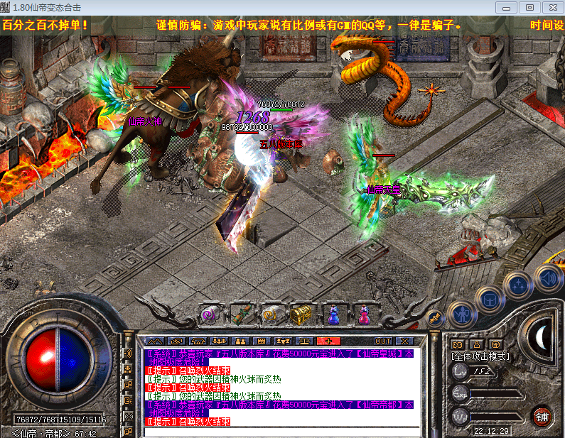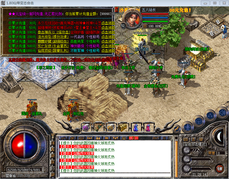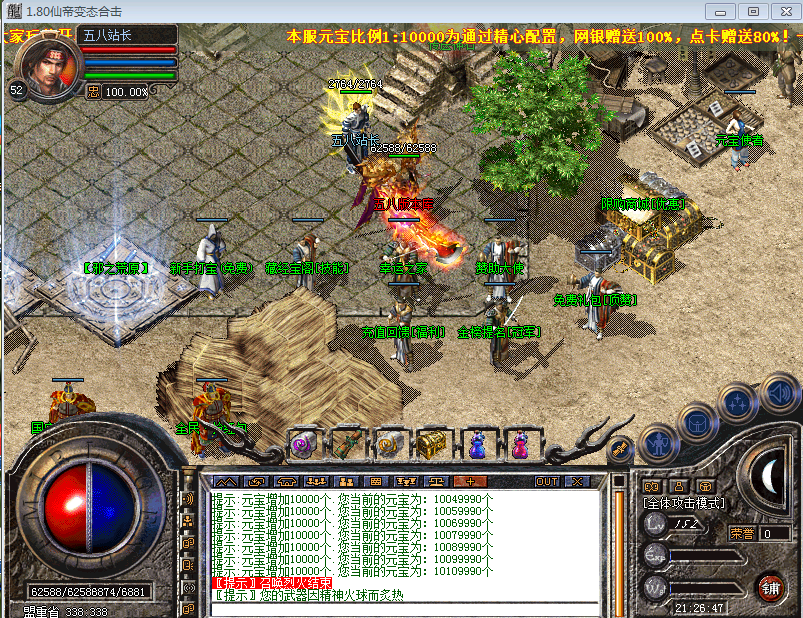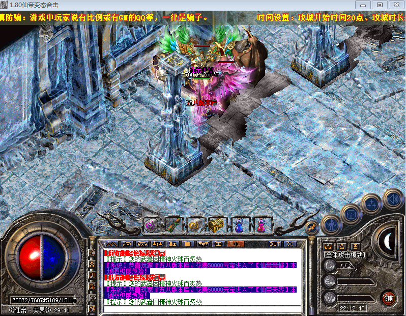 【元宝比例】本服元宝充值比例为1:10000网银赠送100%,点卡赠送90%,测试赠送20%,多冲多送,超值消费! 【版本介绍】本服为1.80极品星王升级版,原有基础上做了重大更新,游戏更激情,上线即可进入超爽PK模式! 【赞助介绍】独家超低消费,顶级赞助设置最高100米,散人可以使用基础装备兑换顶级赞助,真正的草根消费! 【仙币系统】新增仙帝币系统,所有小怪均可爆出,1比500永久回收,散人赚钱的天堂,边打游戏边赚钱! 【限时商城】为方便玩家更好的游戏乐趣,限时商城推出一系列的材料物品,绿色游戏平台,欢迎新老玩家光顾! 【神器系统】更新特殊神器系列装备,三职业协调到最佳平衡状态,任何职业都有用武之地,玩什么都不怕欺负! 【最新活动】喜迎中秋,本服更新大量以中秋为主题游戏活动,请各位玩家到游戏详细体验,进入游戏惊喜不断! 【装备回收】本服永久回收装备,无论新区和老区,回收价格一样,任何方式秒到帐,保证玩家的利益! 【封杀外挂】使用最新定制版登陆器,封杀一切加速外挂,无视任何脱机辅助,有种来挑战,本服绝无外挂存在! 【注意骗子】本服无GM,无客服模式,不要相信游戏任何冒充客服GM的,任何说是GM的全是骗子,请提高警惕! 【注意骗子】本服无GM,无客服模式,不要相信游戏任何冒充客服GM的,任何说是GM的全是骗子,请提高警惕! 【注意骗子】本服无GM,无客服模式,不要相信游戏任何冒充客服GM的,任何说是GM的全是骗子,请提高警惕!