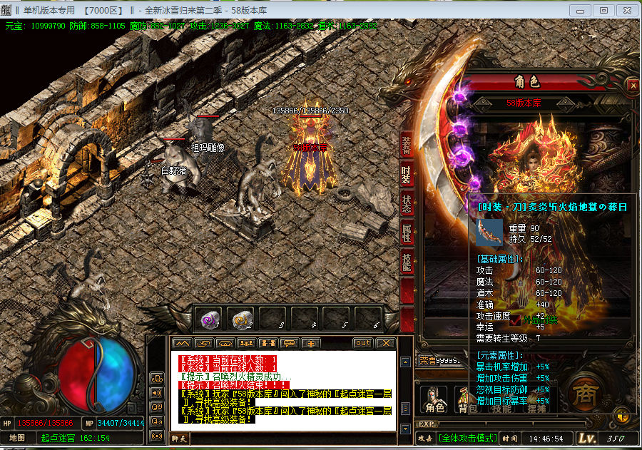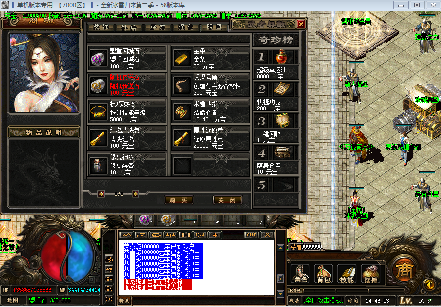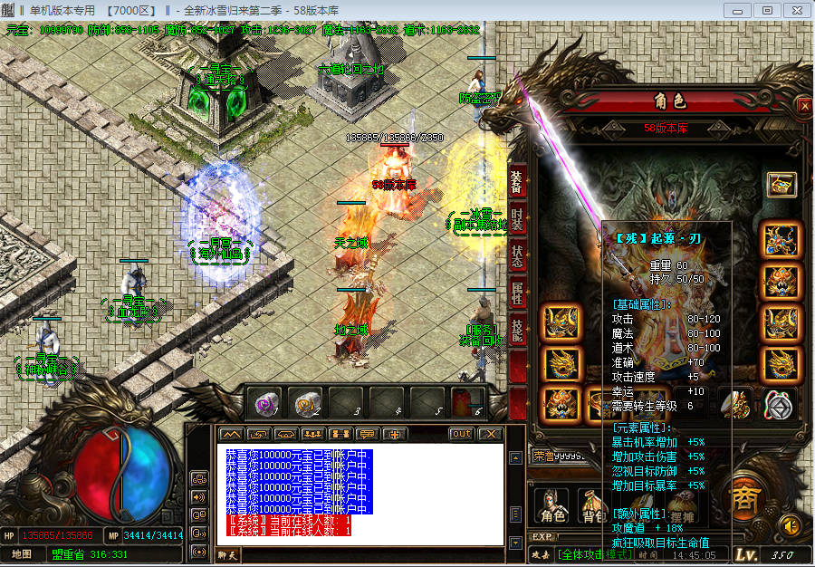本服重金打造唯一单职业冰雪服,新增装备、新增地图、新增老怪、新增活动;新增焚化炉回收灵符,保证长期散人有混头。所有高级装备均灵符回收。增强一键回收功能,对以前不能回收的史诗、传承、罕世可回收元宝和经验;对上古、起源、盘古、生肖和稀有单件极品都回收送灵符。
