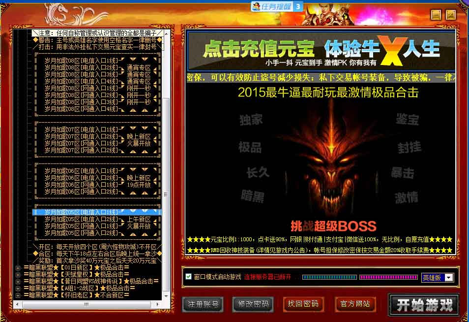 元宝充值】:短信充值1:1000 点卡充值赠送90% 支付宝、财付通、微信、网银充值赠送100% 【开区合区】:每天开放四个区,上午10点,下午15点,晚上19点,通宵22点,开区第二天下午18点左右合区,晚上统一集体拿沙【拿沙奖励】:首次拿沙奖励40万元宝,之后天天拿沙奖励20万元宝,节假日或者合大战区拿沙奖励以登录器上为准 【推荐职业】:本服三职业相对平衡,可根据自己喜好任意搭配,道道、法法 、道法,打装备元宝快,战战、道道、道战PK都没问题,一般都双开 【激情活动】:全天15个激情活动,让你根本停不下来,有些活动完全靠运气,所以散人装备不好只要你参与了一样可以拿到活动奖励 【装备顺序】:赤月→雷霆→战神→星王→狂雷→三龙→虎威→龙威→主宰(主宰首饰 目前只有高级鉴定有几率出,后期会更新,装备绝对保值)【职业平衡】:战士,道士,法师:三职技能平衡.(装备全爆) 装备属性精准调试,不变态,不秒杀 ,绝对保值!【鉴定神技】:可鉴定的神技:魔道麻痹-麻痹-战役麻痹-八卦护身-重生,运气+恒心,最终会鉴定出您想要的神技装备的【武器暴击】:完美升级暴击系统,衣服、武器和勋章最高可鉴定出4点暴击,暴击+20以上,可刀刀飘血, 本服暴击不难弄,散人也能暴击20 【二级密保】:不同于其他二级密保,只有你IP出现变化了才需要输入,可以很好的防止别人木马或者情感 盗号、骗号【称号系统】:70级可领取【暗黑战神封号】80级【 暗黑米老封号】90级【暗黑主宰者封号】100级领取【 暗黑破坏神封号】 具体属性游戏中查询 【赞助大使】:青铜-白银-黄金-钻石-至尊赞助大使,不同赞助大使的特权也有所不同,赞助大使只能通过充值获取,也可以 累积充值升级,需联系客服 【四级技能】:所有的四技技能书,可以在尸王殿打书页 ,然后到武器店门口找神秘使者合成获取,散人玩家可以打书页赚取元宝【每日任务】:每天可以进聚灵岛开始捉龟任务,还可暴出聚灵珠, 签到+完成任务+聚灵珠+打装备回收,每天最少可以升2-3亿经验【每日签到】:每天登陆游戏,找盟重老兵免费领取1亿经验, 真的是免费的,千万不要忘记哦,所有玩家都能领取免费领取 【一键回收】:普通装备可以通过一键回收NPC一键回收,打到在线回收卷轴,可以随时随地在线回收,方便快捷,升级打元宝速度超快【特技回收】:10万元宝回收麻痹、魔道麻痹;20万元宝回收战役麻痹;50万元宝或100米回收八卦护身;100万元宝或200米回收重生【聚灵宝珠】:专为散人而设,聚灵岛内可暴出小-中-大三种聚灵珠,可聚集1000-5000万经验,聚满经验散人可以自己吃或摆摊卖米玩家赚元宝 【暗黑军团】:暗黑联盟独家【暗黑军团攻沙】系统, 通常合大战区或者节假日的时候举行大型暗黑军团攻沙活动,场面宏大,百人拿沙 【怪物攻城】:每周六晚上八点,在暗黑之城举行大型怪物攻城活动, 本服所有BOSS倾巢出动,场面宏大,装备狂暴【长久稳定】:长久开放,用心服务每一位玩家,现在玩传奇的基本都是我们80后的,也算是一段难忘回忆吧,80后的玩家,请支持暗黑 联盟==============================================================