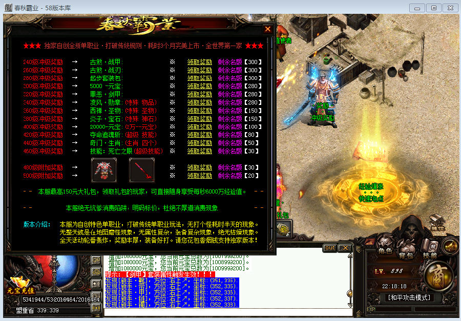 健康游戏忠告抵制不良游戏,拒绝盗版游戏。注意自身保护,谨防受骗上当。适度游戏益脑,沉迷游戏伤身。合理安排时间,享受健康生活。为了您的游戏体验,请不要使用非官方的第三方辅助插件。游戏中有改动或更新恕不另行通知。祝您在游戏中玩的愉快、开心! 【版本介绍】 2017跨年巨作 《春秋霸业》 轻变单职业 全新自创新版本,你绝对没有玩过,全球仅此一家,请支持独家版本!!!【元宝比例】 元宝比例 1:10000 网银多送100% 点开多送90%【版本说明】 耗时三个月呕心力作,完美上市,绝对独家版本,不同于任何单职业!打破传统枯燥玩法 无需一个BOSS磨你半天。【版本说明】 新区开放三小时内赠送【千米红包】,超多活动全天轰炸,好礼赠送无垃圾奖励,装备非常好打 无任何限制爆率。【版本说明】 装备靓丽,属性完美,易懂不复杂,结合多版本精华打造,专为散人设计,启动门槛低,人人玩的起,人气火爆,天天有激情!【版本说明】 请花费您宝贵10分钟游戏体验,绝对独家版本,全新地图,全新怪物,全新系统,保证所有装备全部能爆全天活动!【版本说明】 开区第二天下午合区 晚上20点激情攻沙 奖励非常丰厚 游戏内查询 ! ! !