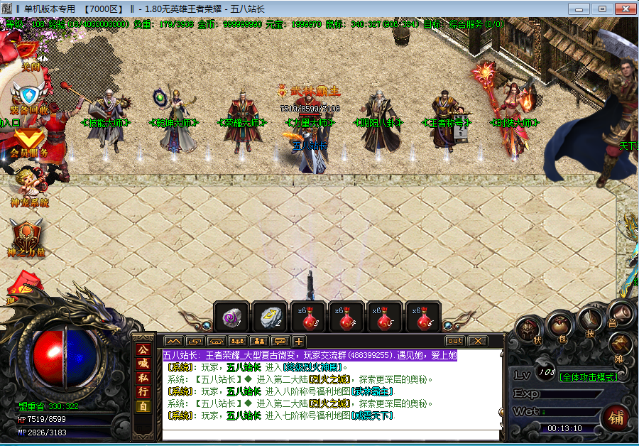 天下英雄出我辈,一入江湖岁月催; 皇图霸业谈笑间,不胜沙城一场醉。 ————————————————2017年私-服界最轰动的人气场面-【区区活人1000】【介绍】保证单区人气,每天重金三个新区【介绍】攻沙新区奖288米.战区奖588米.统战区888米.大统战奖1888米【介绍】一切材料全靠打,超多限时回收福利,终级保值永久回收【介绍】实力打造1.80大型复古微变,简单暴力无套路,超越单职业【介绍】充值帐号:按20%可回收任何新区,真正帐号永久保值【介绍】[充值比例]金-币1:5000,王者币1:100 网银赠送100%